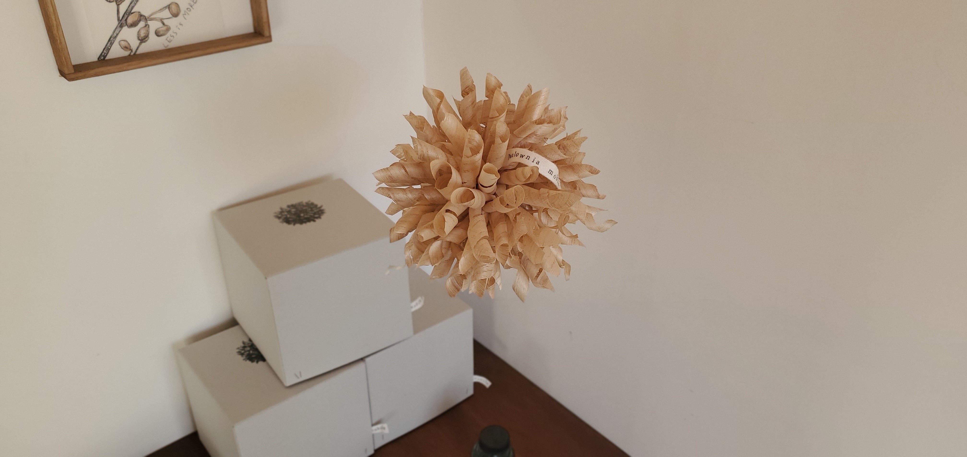 製品を作る時の副産物であるかんな削りを使い、軽く揺らめく桐モビールを制作しました。